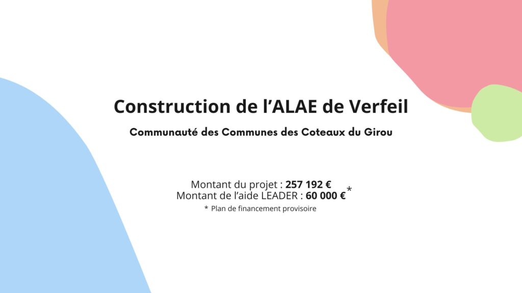 En complément de construction de la nouvelle école de Verfeil, la CC des Coteaux du Girou porte le projet de construction des bâtiments ALAE/ASLH adjacents à cette école. Au total, ce sont cinq salles d’activités élémentaires, trois salles d’activités dédiées aux maternelles, un dortoir et un relais petit enfance qui composeront ce lieu.