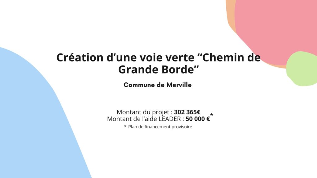 Dans le cadre d’un programme pluriannuel de réalisation de cheminements doux, la commune de Merville souhaite créer une voie verte « Chemin de Grande Borde » qui formera un maillage reliant l’ensemble des points d’intérêts de la commune. Cette réalisation comprend une piste cyclable dotée de trottoirs sécurisés.